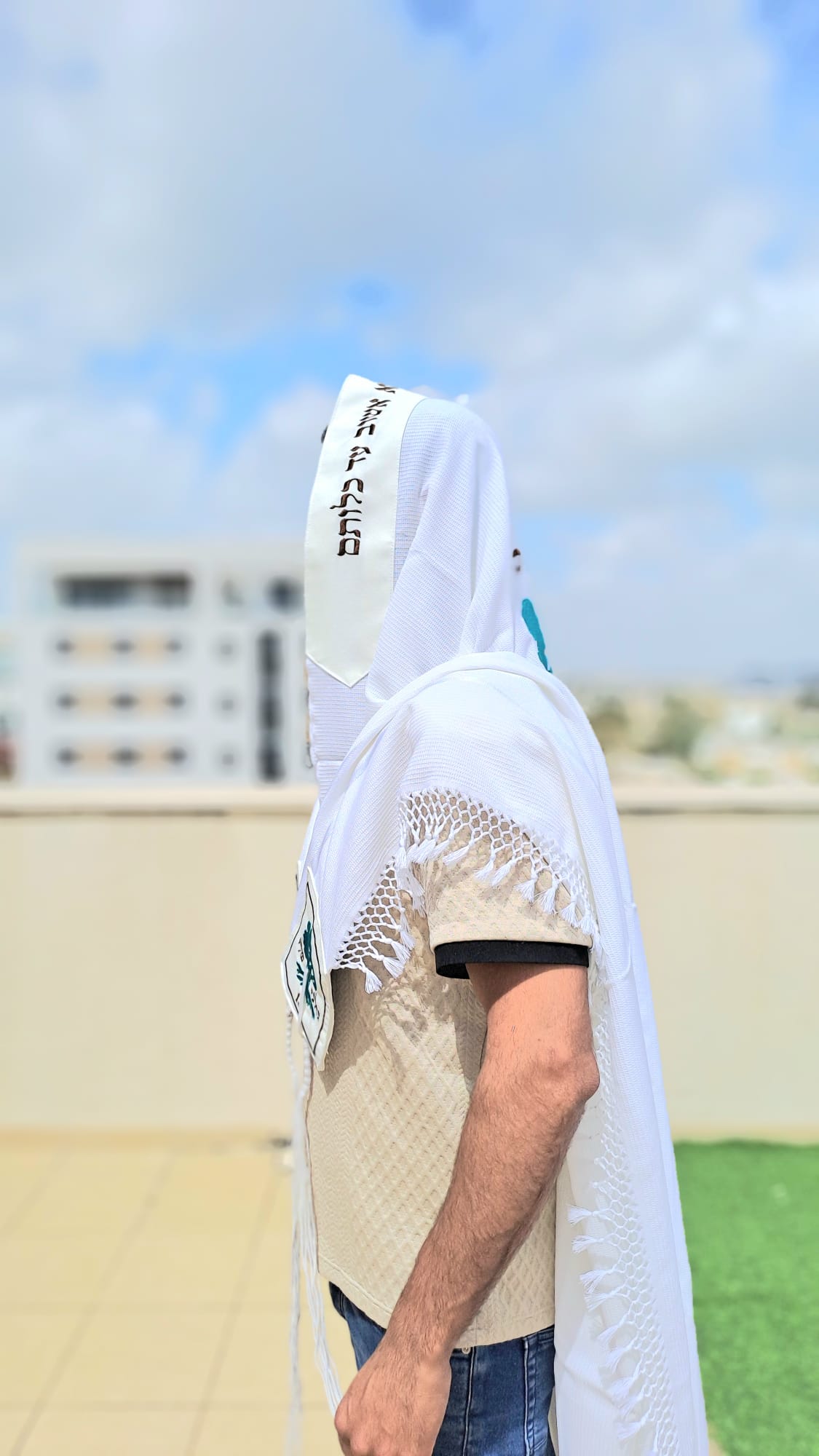 טלית צמר לבנה יוקרתית מהודרת בעיצוב "גולני" עם רקמת שם אישית