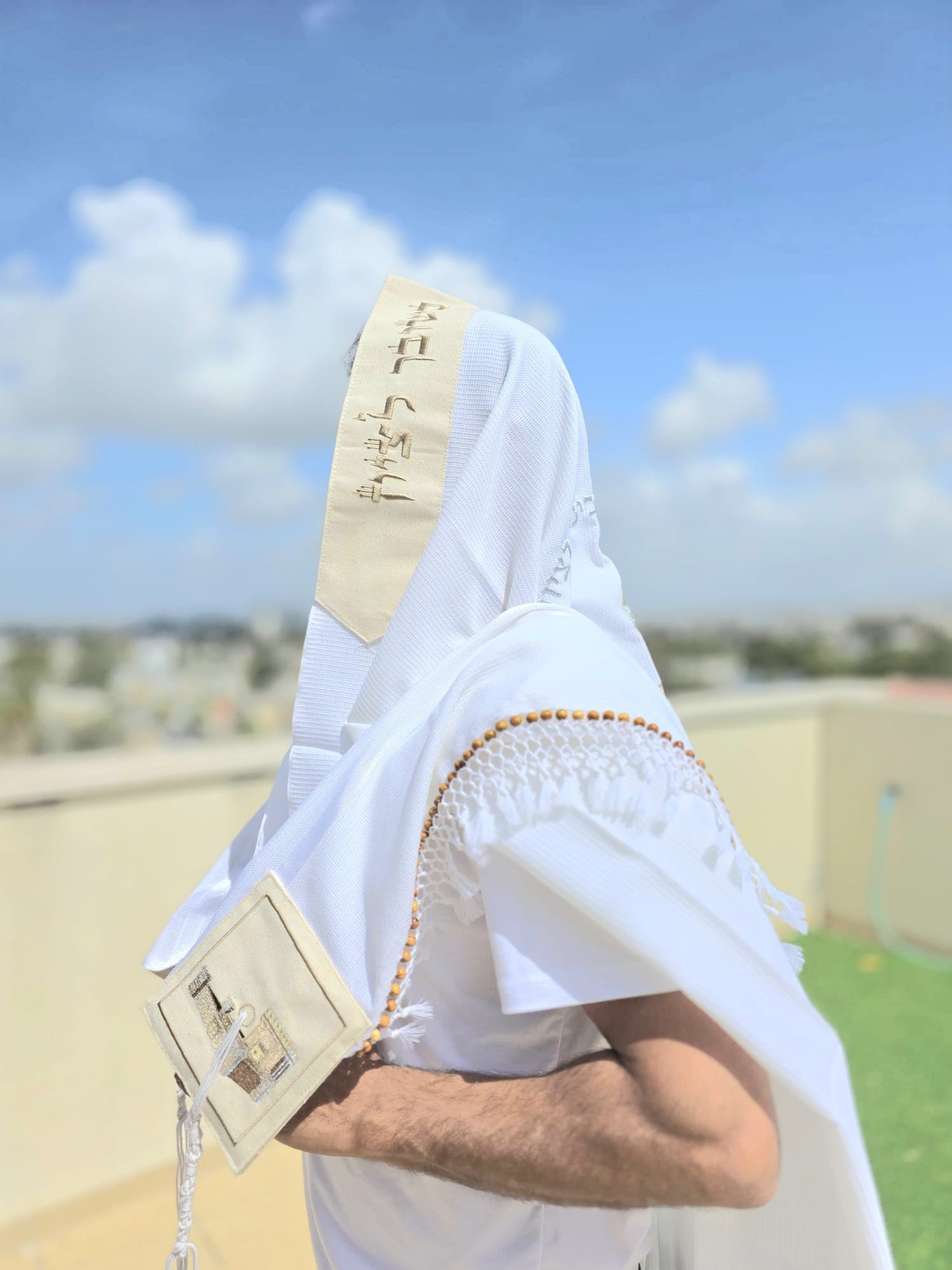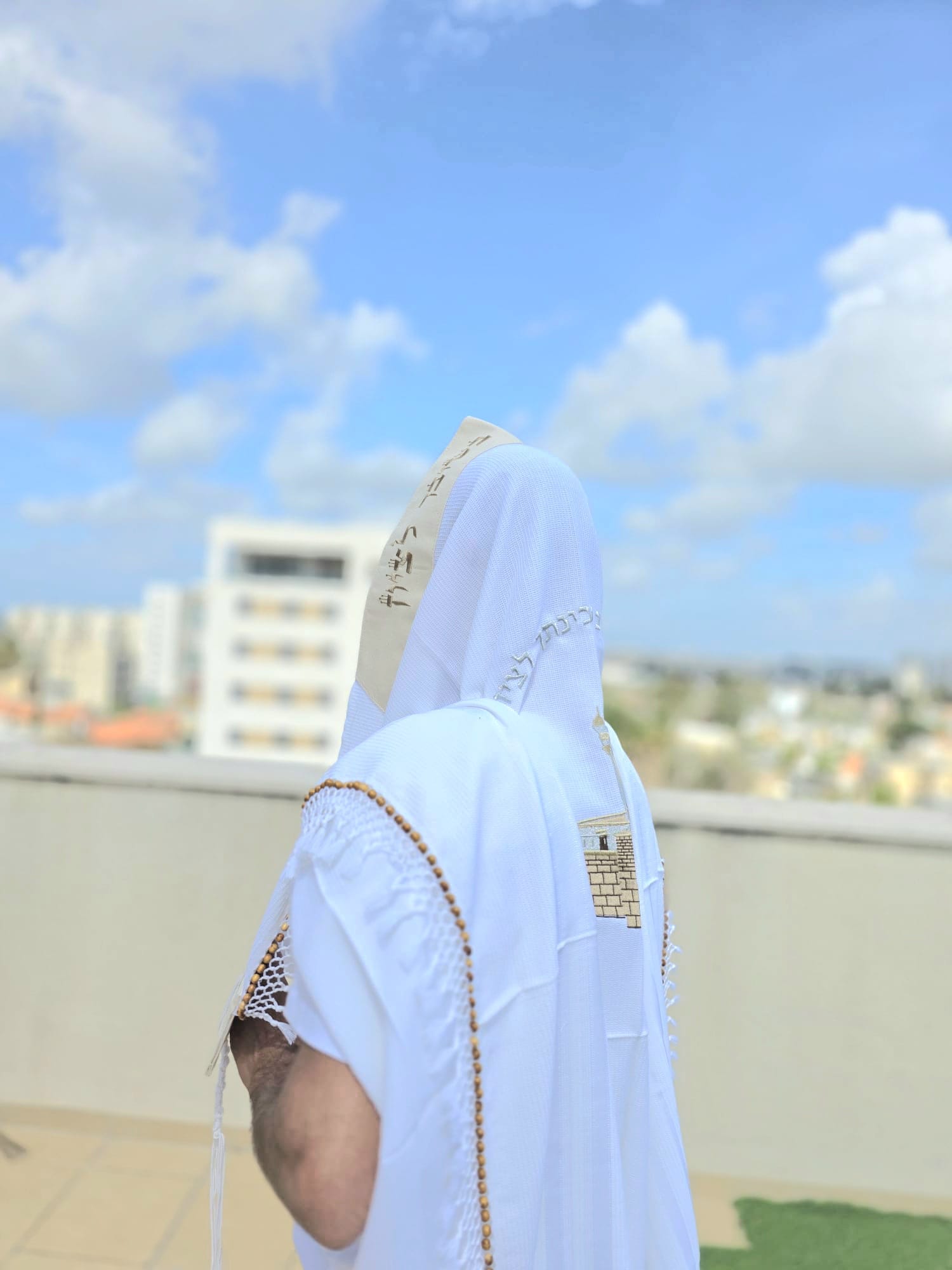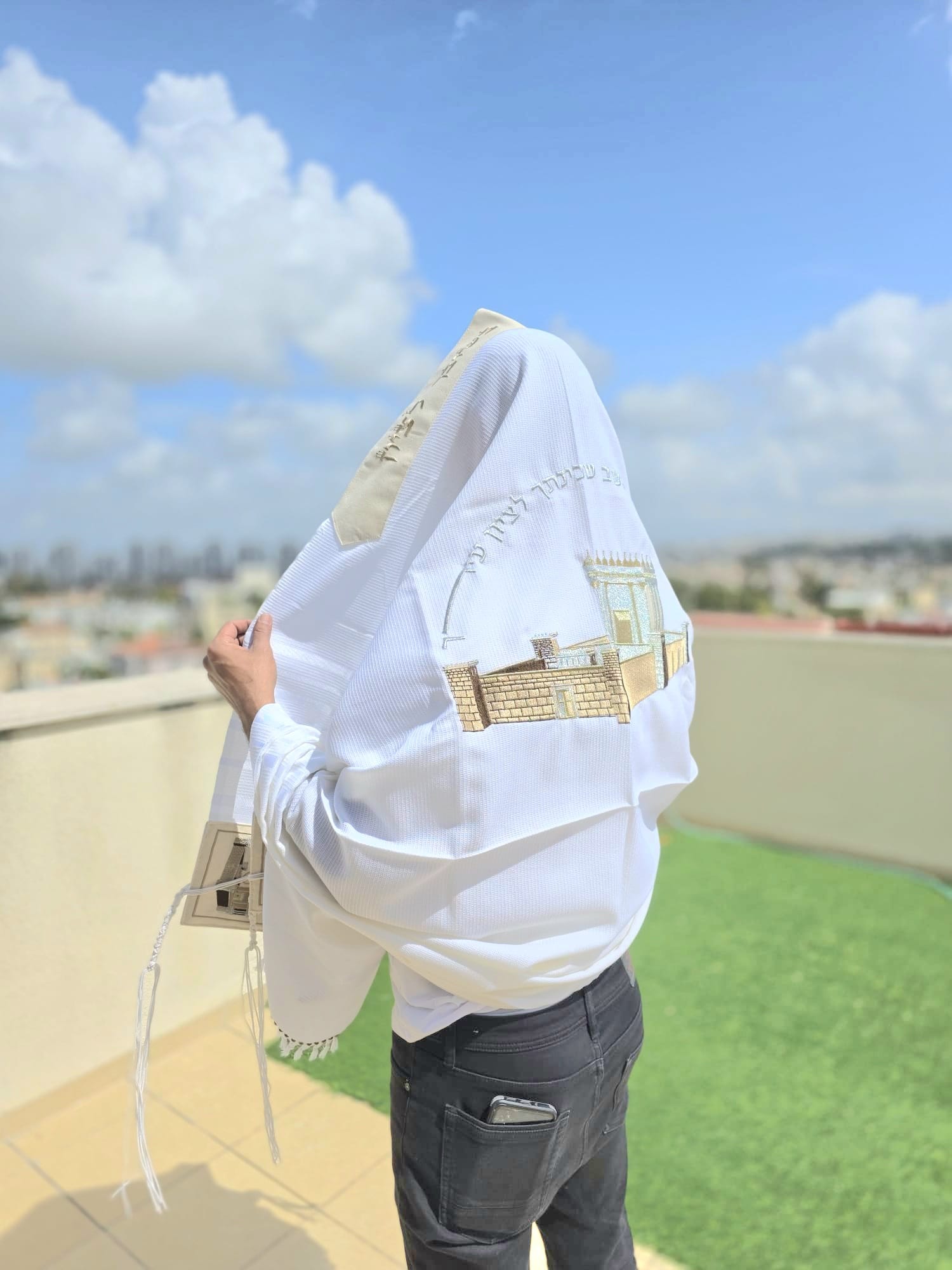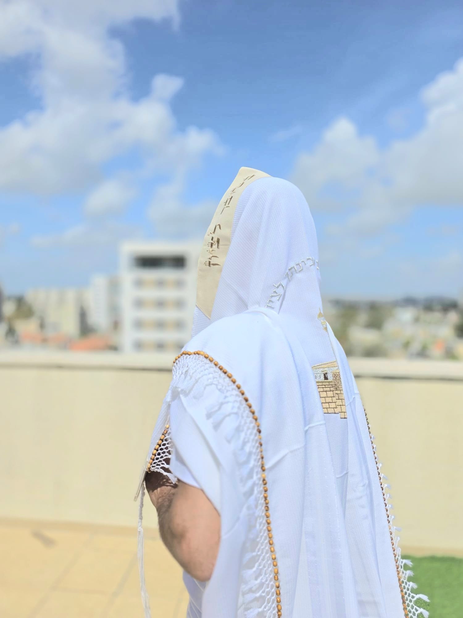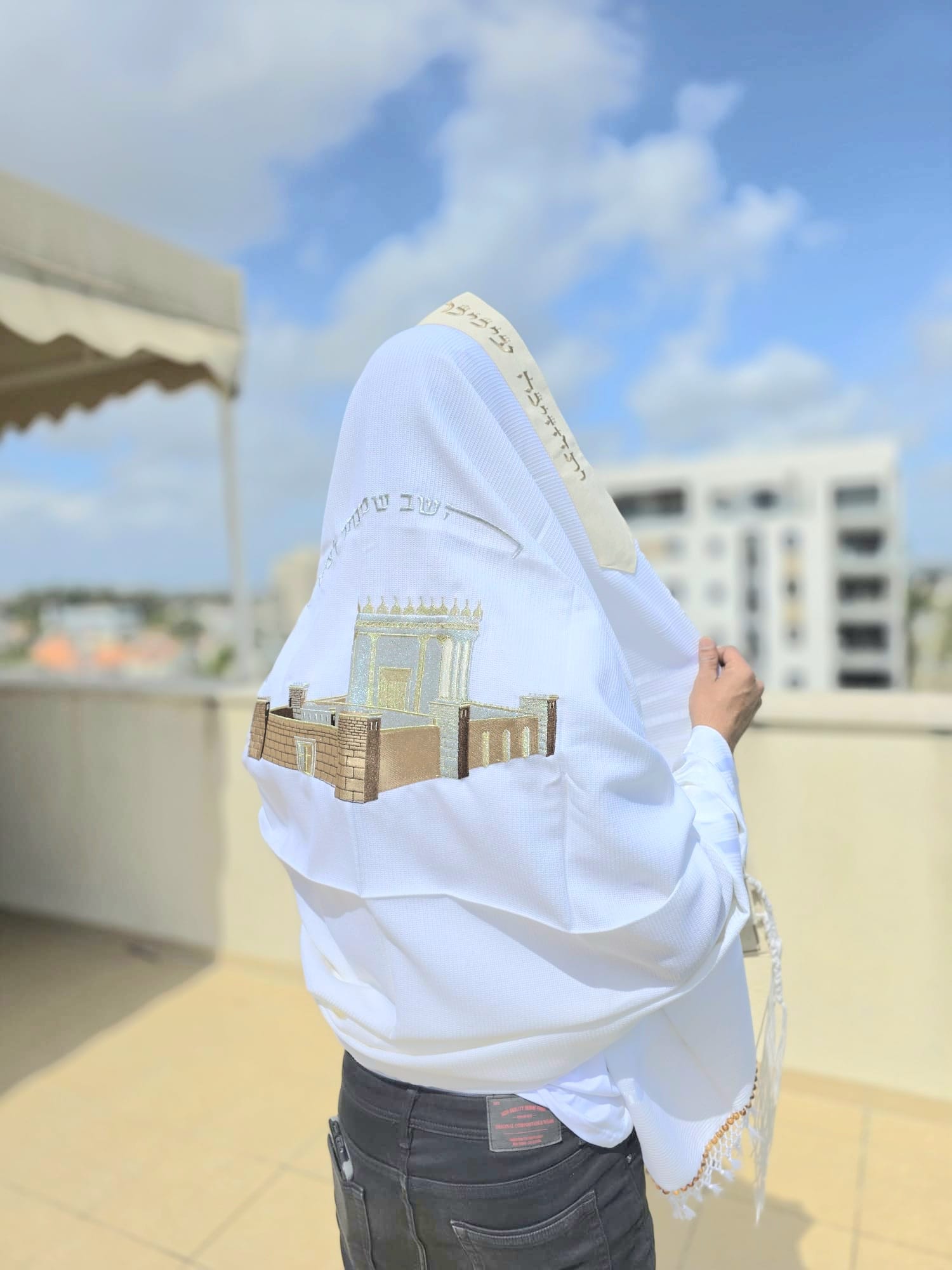 בית המקדש מלא פאר והדר על הטלית!!! ⚜️⚜️⚜️ טלית מהודרת בעיצוב שלא תמצאו בשום מקום!!! טלית מהודרת 100% צמר מונע החלקה, בעיצוב "בית המקדש" על הגב של הטלית במרכז הטלית, רקום בית מקדש מפואר בעיצוב גרפי יפייפה ומושלם.. בצבעים של זהב נוצץ וכסףעיצוב שנותן לטלית מראה מושלם ויפייפה שאין שני לו… 🔥 כאשר מעל בית המקדש רקום הפסוק "השב שכינתך לציון עירך".. בצבע כסף נוצץ.. העטרה של הטלית עשויה בד צבע אופוויט גס בצורה עדינה, ועליו רקום הפסוק "ותחזינה עינינו בשובך לציון".. פסוק מלא רגש מתפילת שמונה עשרהבעיצוב שנותן לטלית מראה אותנטי יפה ומרגש… ❤️ הפינות של הטלית עשויות בד תואם לעטרה של הטלית, ובצורה כפולה מלמעלה ומלמטה על מנת לתת לטלית יציבות ויופי ולשמור על המראה המהודר של הטלית… על הפינות של הטלית רקום דגם יפייפה של בית המקדש בצורה מוקטנת.. ובשילוב צבעים מושלם.. כך שהטלית שומרת על מראה נקי.. עם עיצובים יפייפים שהופכים את הטלית לטלית מיוחדתהטלית יכולה להתאים כטלית מתנה או כטלית חתנים יוקרתית.. או אפילו כטלית בשבילך.. להתהדר במראה טלית יפה.. ⚜️⚜️ לאורך כל הטלית, משני הצדדים.. הפרנזים של הטלית שזורים בעבודת יד מרהיבה לרשת של חורים קטנים.. ובתוך הפרנזים מושחלים חרוזי עץ יפייפים… עיצוב שמעניק לטלית יופי בלתי רגיל.. 💎 יש אפשרות להזמין את הטלית ללא שזירת הפרנזים בעבודת יד.. הבד עצמו של הטלית עשוי 100% צמר מונע החלקה עם פסים לבנים.. כך שהטלית שומרת על מראה נקי.. ויחד עם זאת הטלית קלה ואוורירית על הגוף ולא מחליקהחוטי הציצית, עשויים 100% צמר עבה בעבודת יד וניתן לבחור את סוג הפתיל.. פתיל עבודת יד לבן.. או פתיל עבודת יד תכלתקשירת הציצית מהודרת חזקה ויציבה.. כך החוטים של הציצית מחזיקים לאורך זמן והטלית נשארת ביופיה.. ויש אפשרות לבחור את קשירת הציצית לפי המנהג שלך.. קשירת ציצית תימני / רמב"ם.. או קשירת ציצית ספרדי.. או קשירת ציצית אשכנזי… זמן הכנת הטלית אורך כשלושה שבועות.. ויש אפשרות לבחור את מידות הטלית לפי המידה שלך… מומלץ לבחור כיסוי טלית ותפילין תואם ללא עלות למזמינים דרך האתר.. כך הטלית עם הסט יכולים להיות מתנה מושלמת!!! ❤️ יש אפשרות לבחור את כיסוי הטלית והתפילין בקטגוריית כיסוי טלית ותפילין