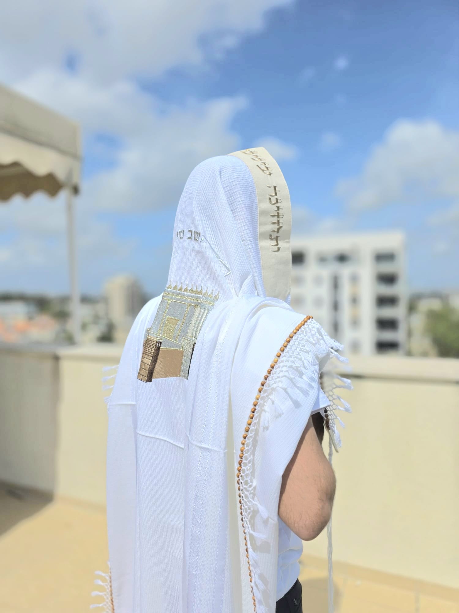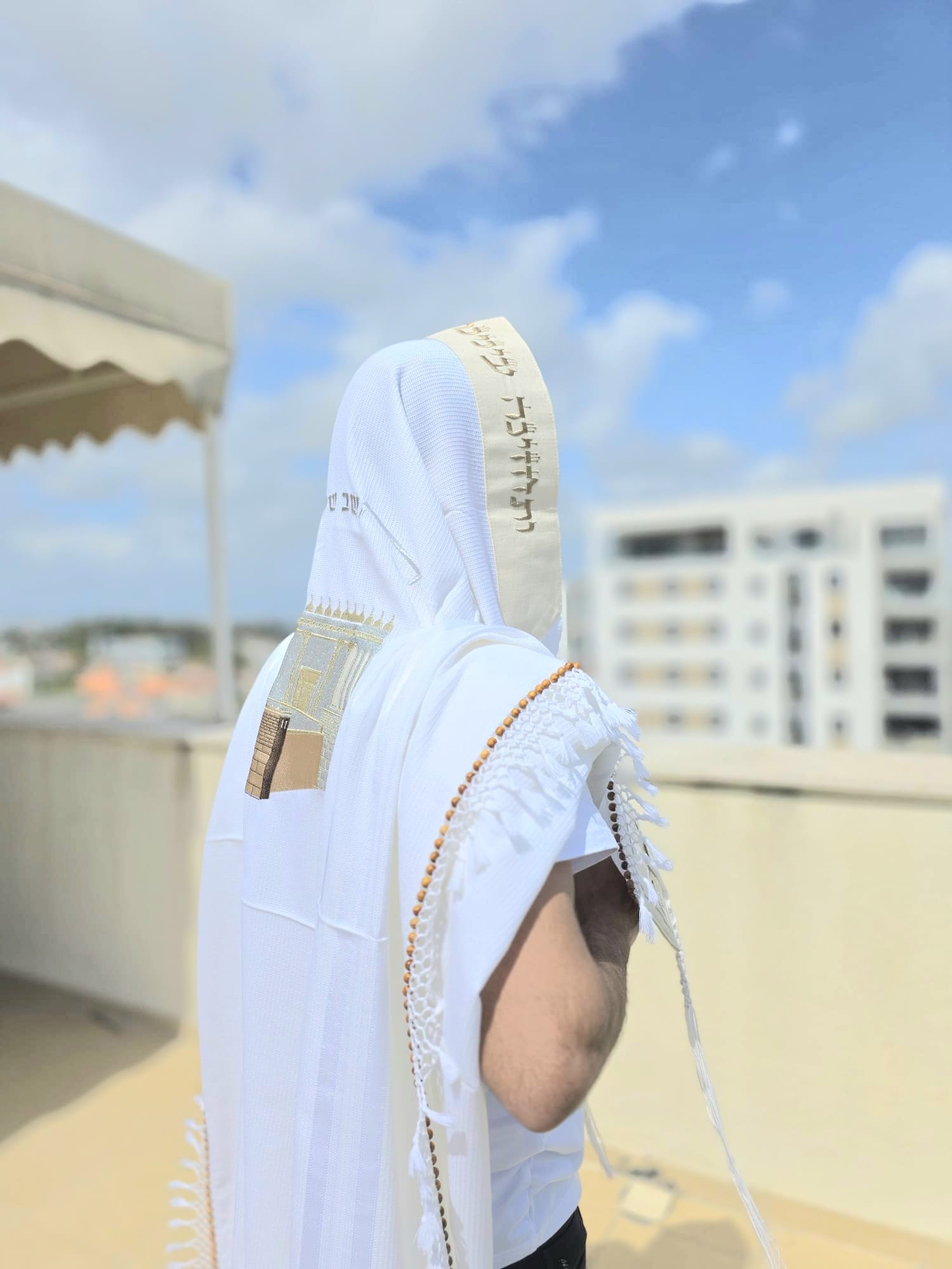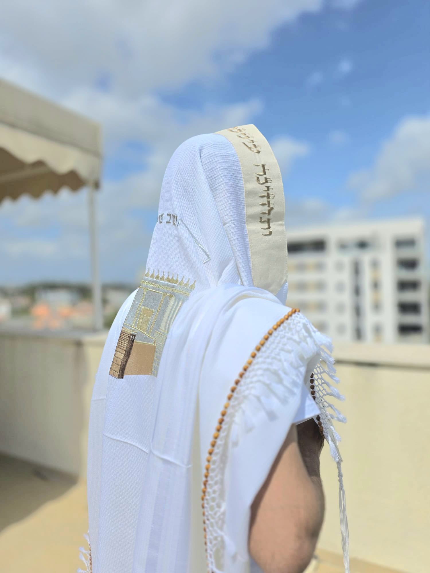 טלית צמר יוקרתית בעיצוב מפואר "בית המקדש – בשילוב חרוזי עץ בעבודת יד"