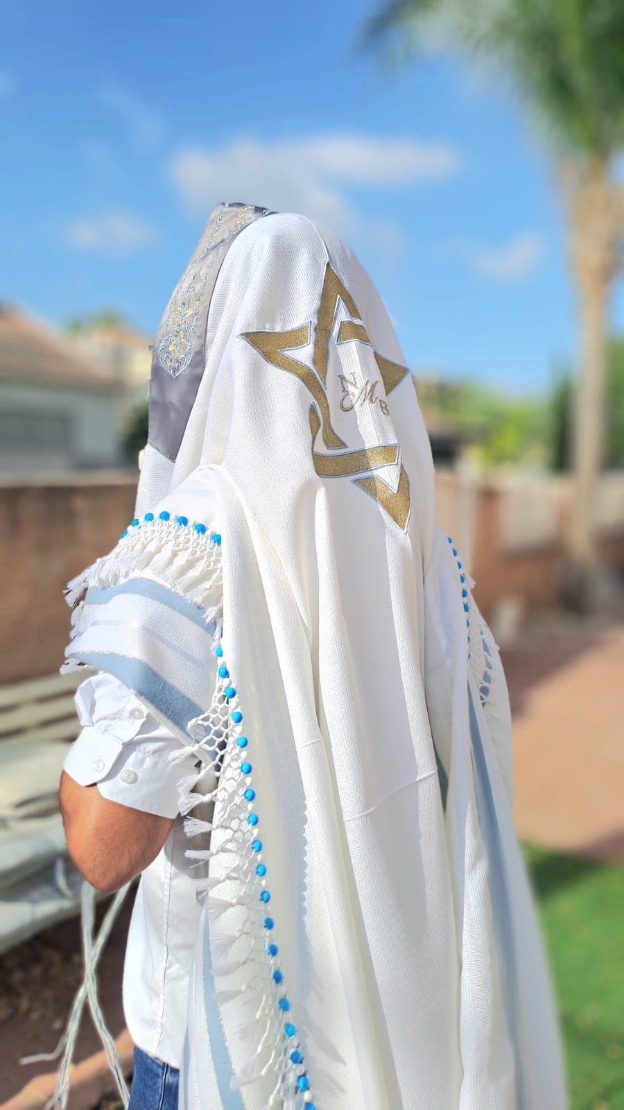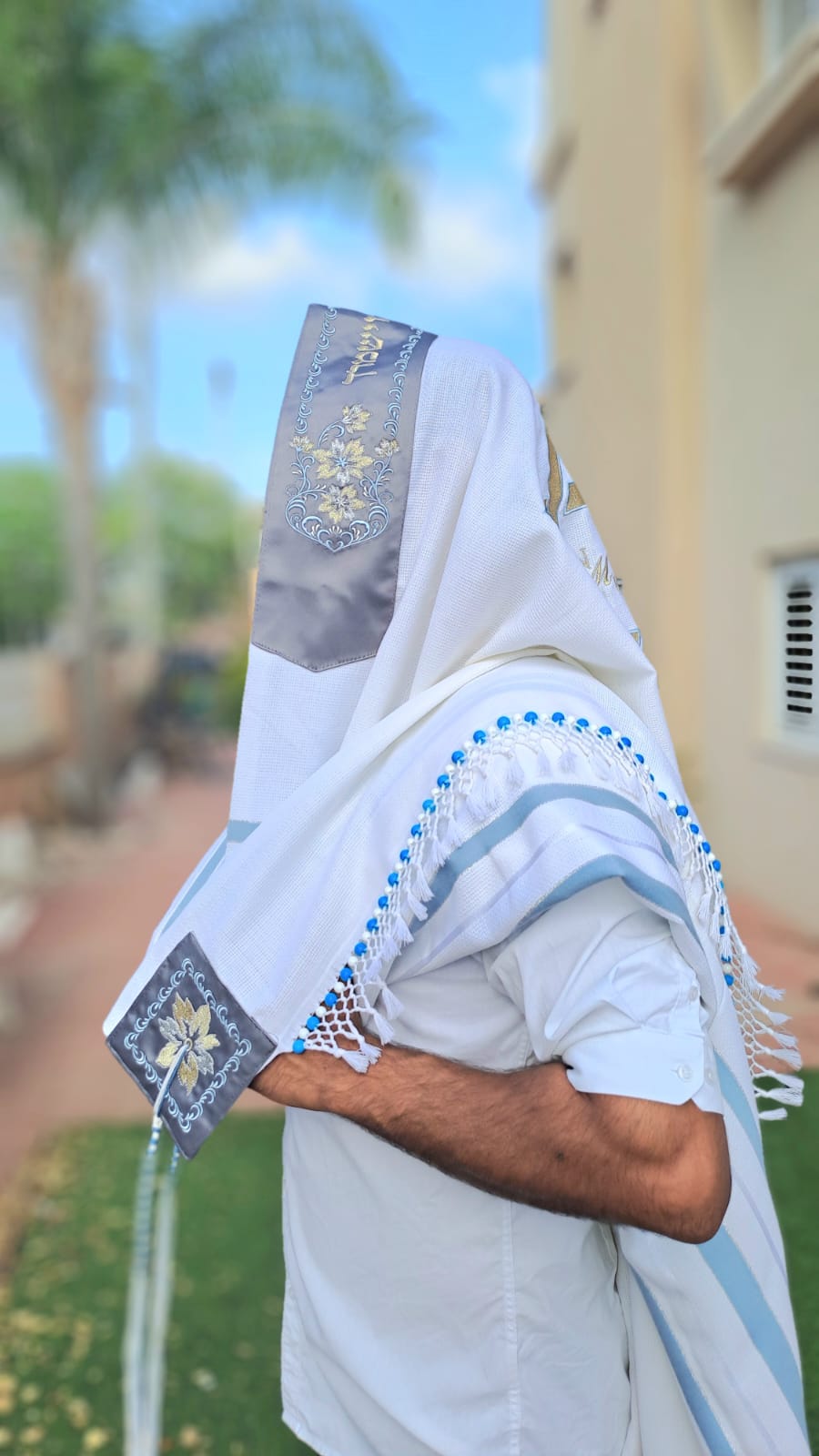 טלית מהודרת בעיצוב יוקרתי "זהב – כסף – תכלת"