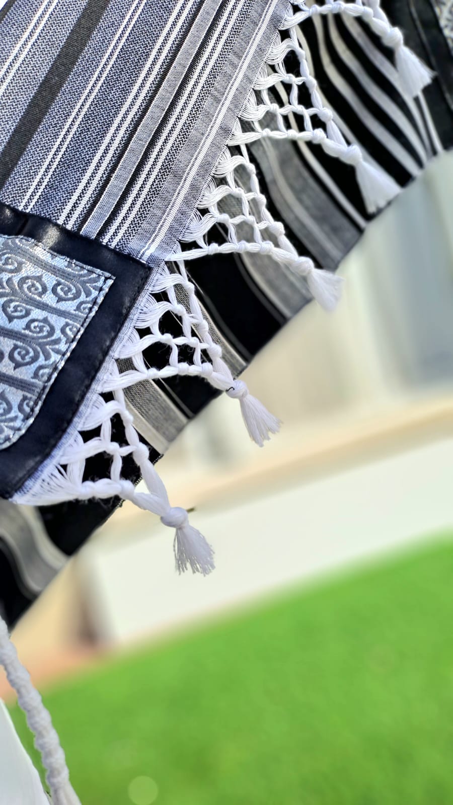 הפרנזים של הטלית, שזורים בעבודת יד אומנותית ומרהיבה לרשת מיוחדת של משולשים לכל אורך הטלית…