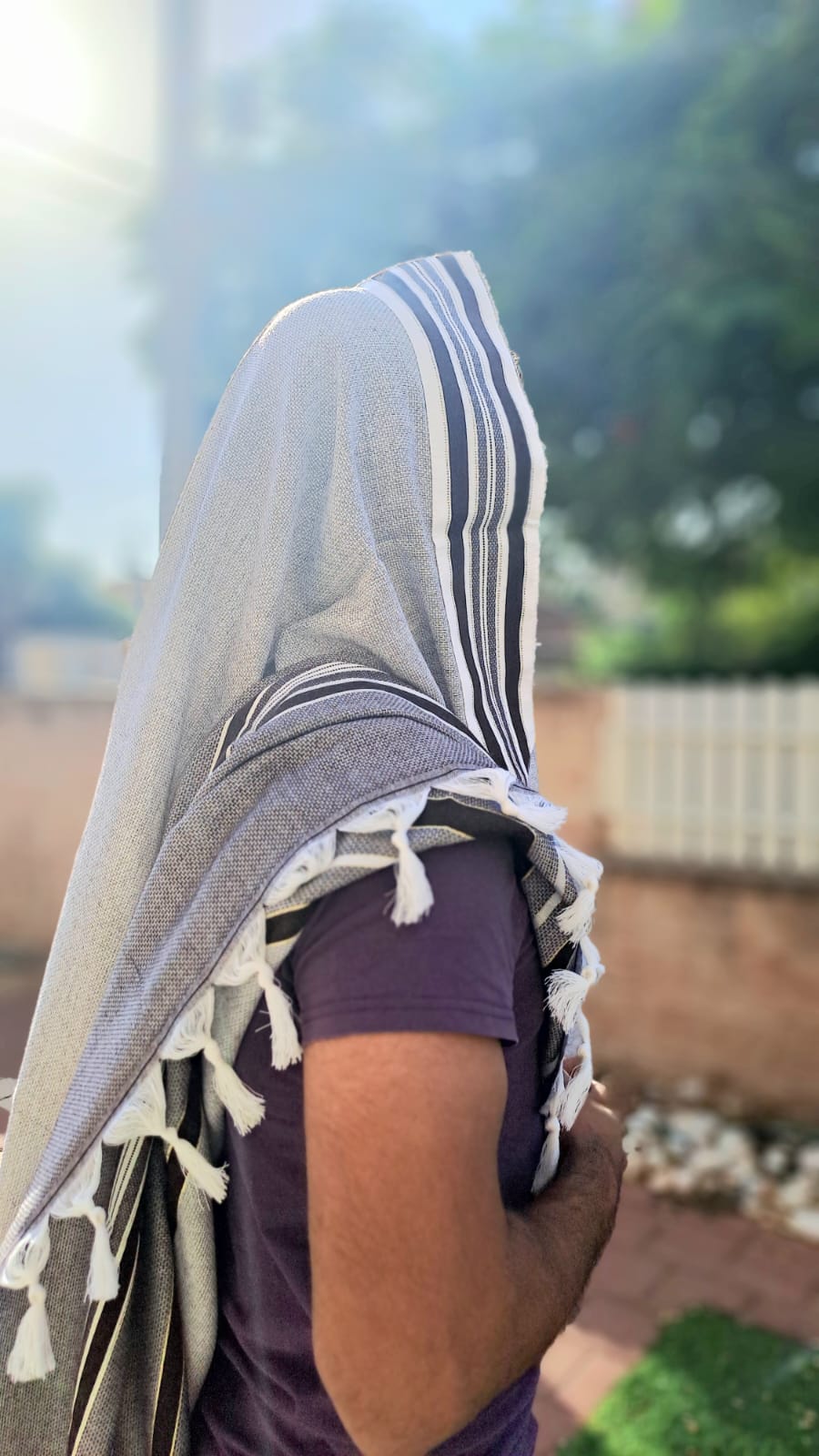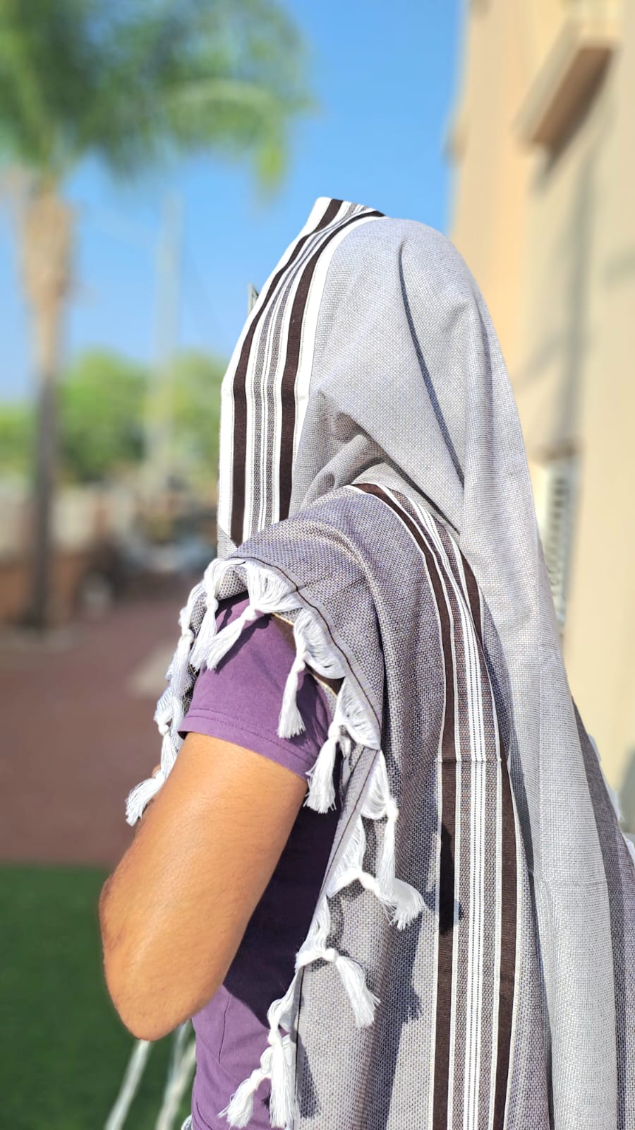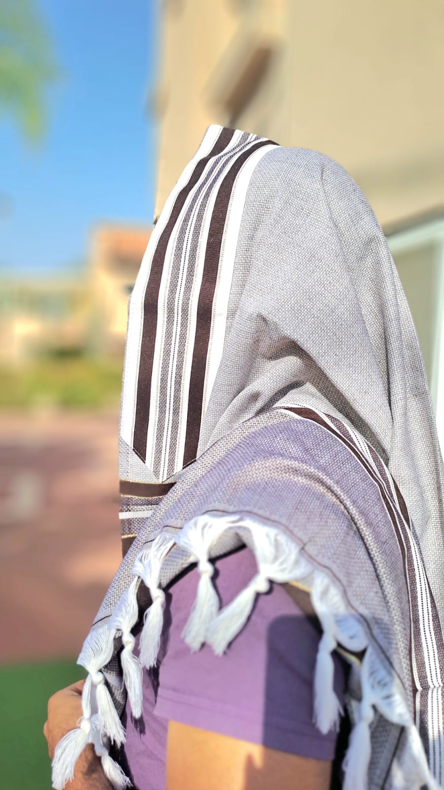 טלית מהודרת 100% צמר מונע החלקה בעיצוב פסים "חום – עדין"