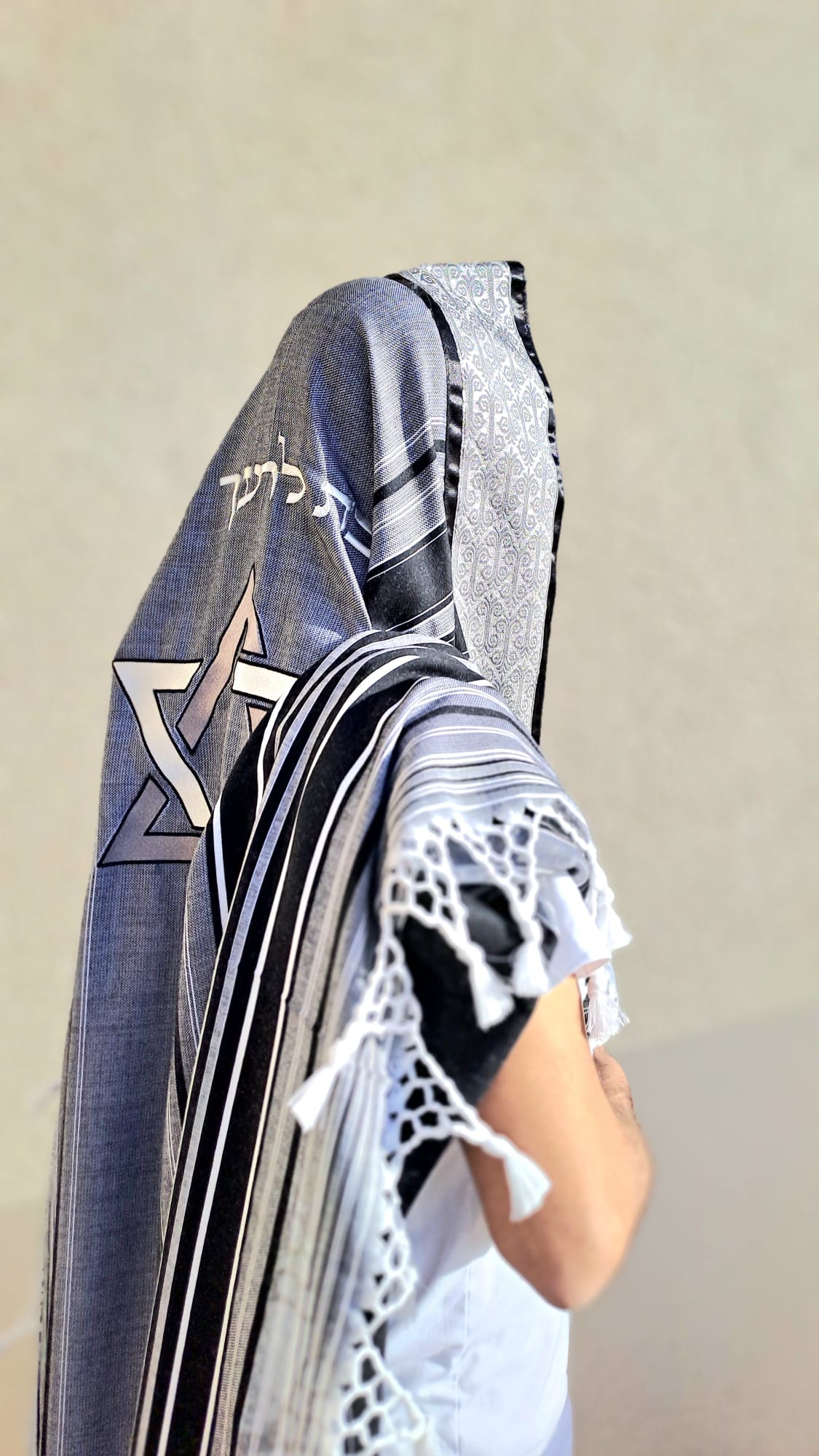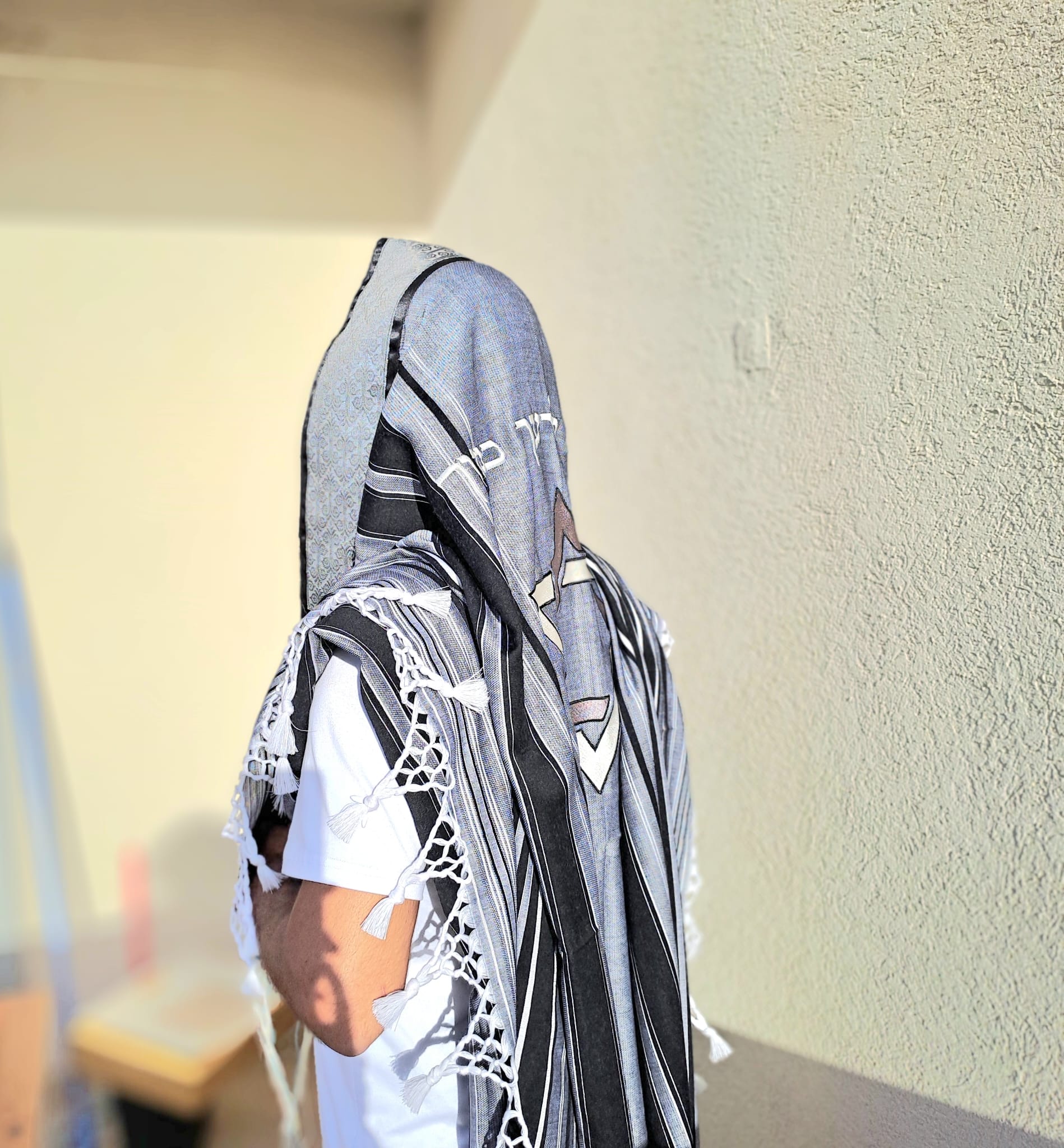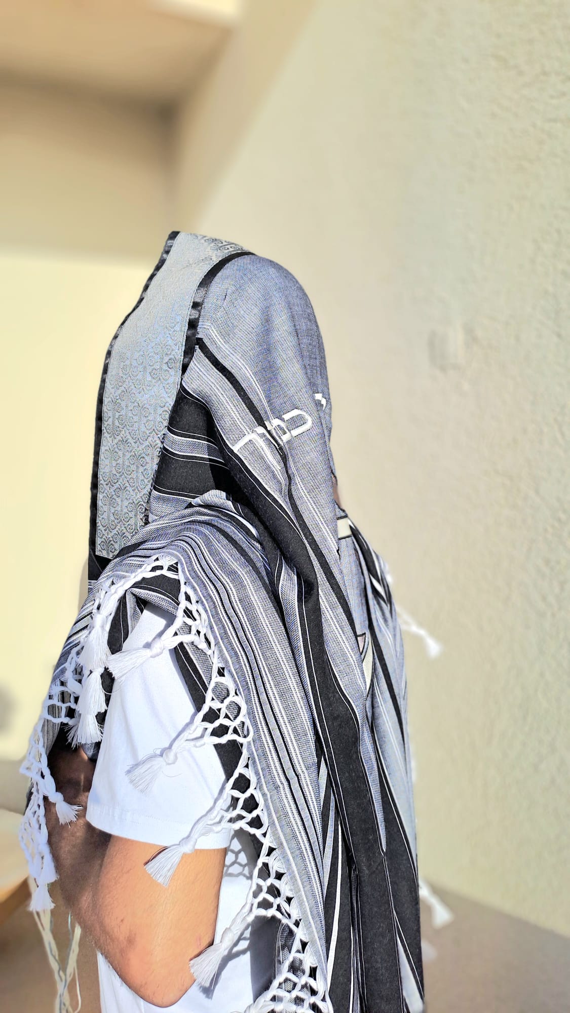 טלית מהודרת 100% צמר מונע החלקה "ואהבת לרעך כמוך" בעיצוב אפור כהה
