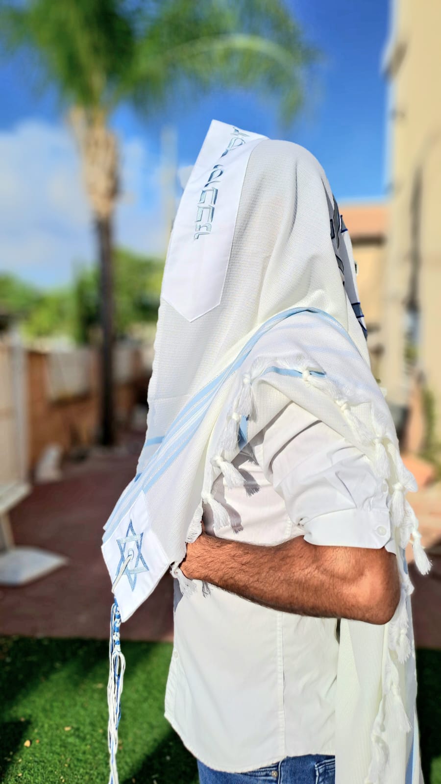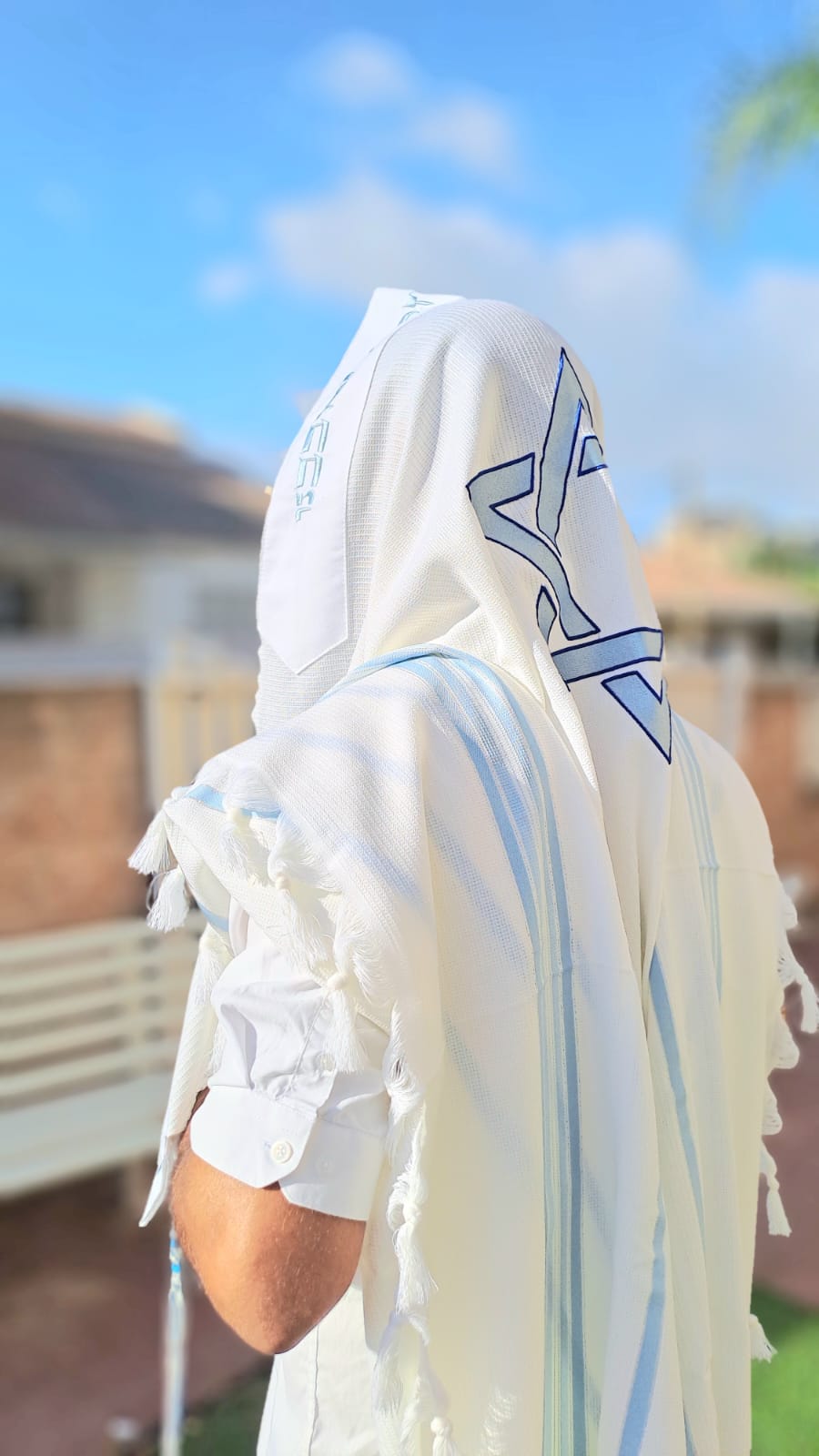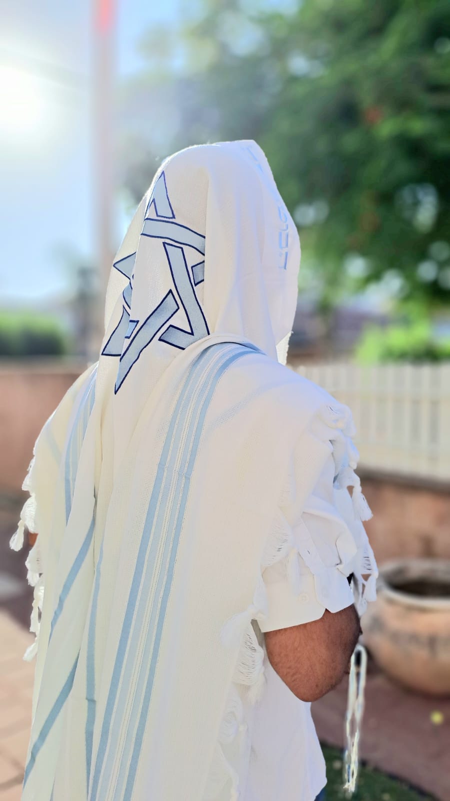 והפינות של הטלית, עשויות בד תואם. כשעל הפינות רקום מגן דוד בצבע תכלת עדין ומיוחד.. 🙏