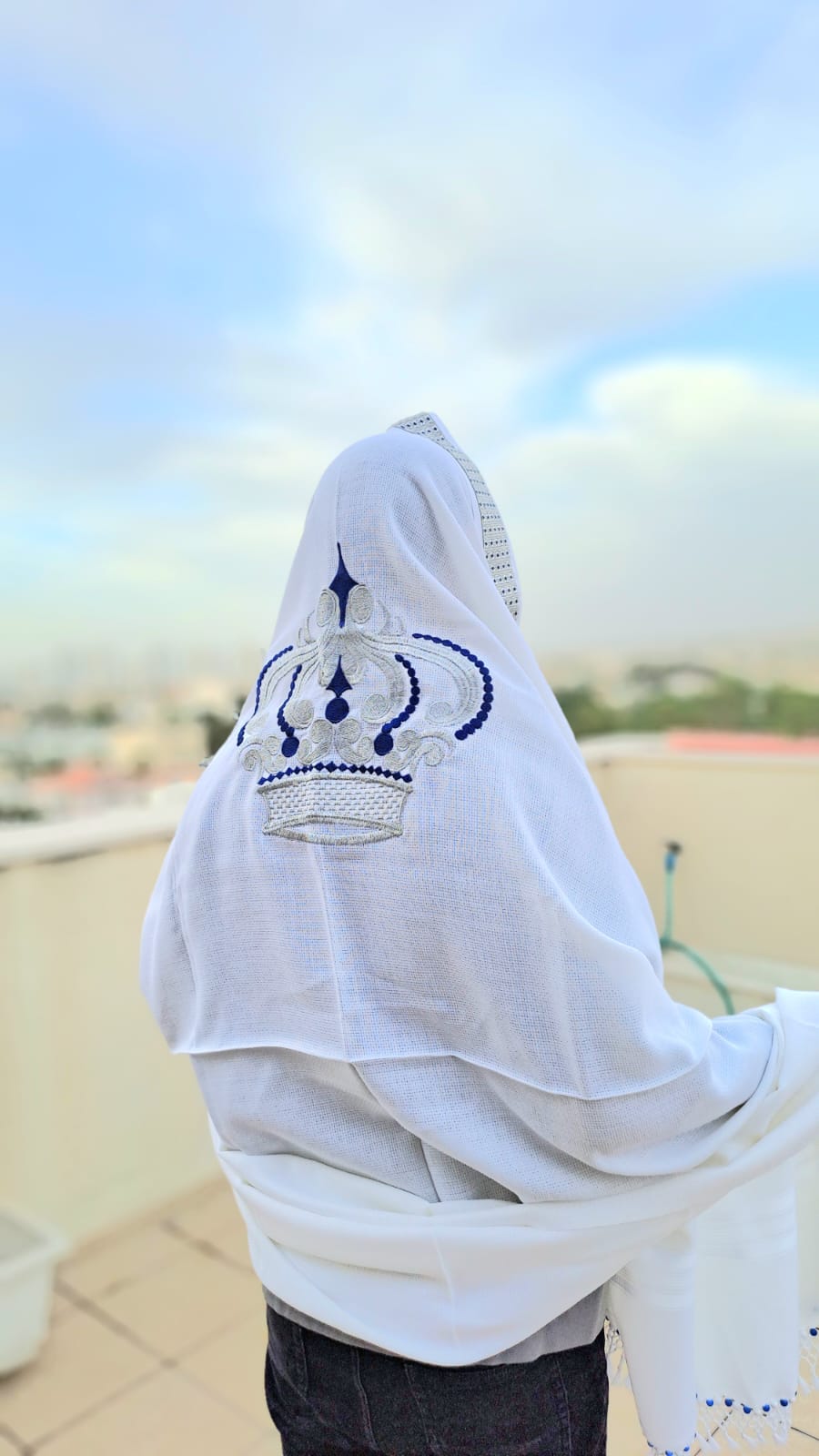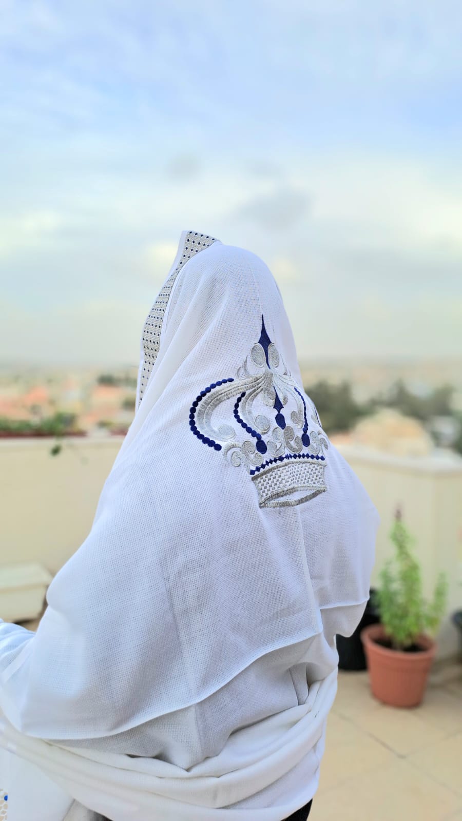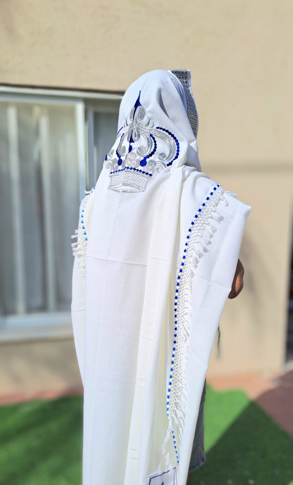 טלית יוקרתית 100% צמר מונע החלקה בעיצוב "כתר – מלכות" כסף נוצץ וכחול