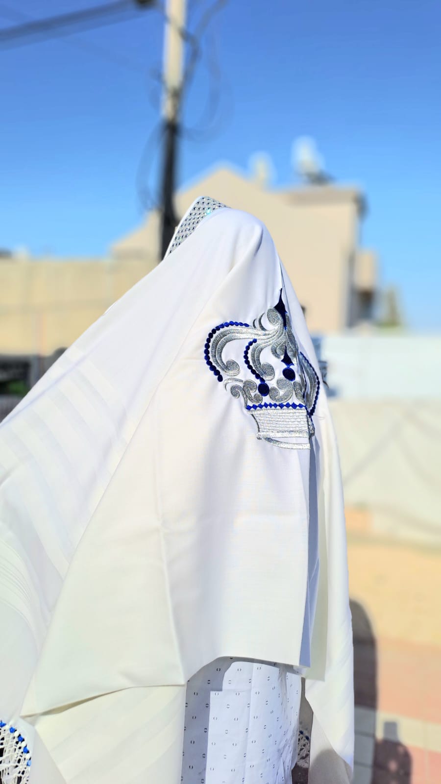 טלית מעוצבת "כתר – מלכות" בסגנון צבעים כחול וכסף 🔥