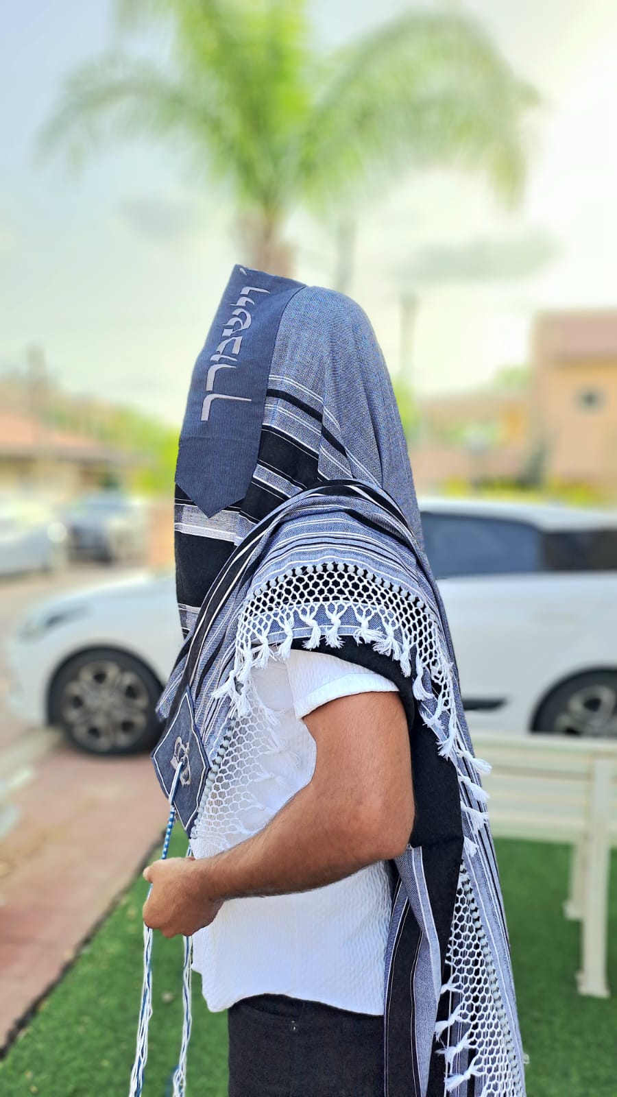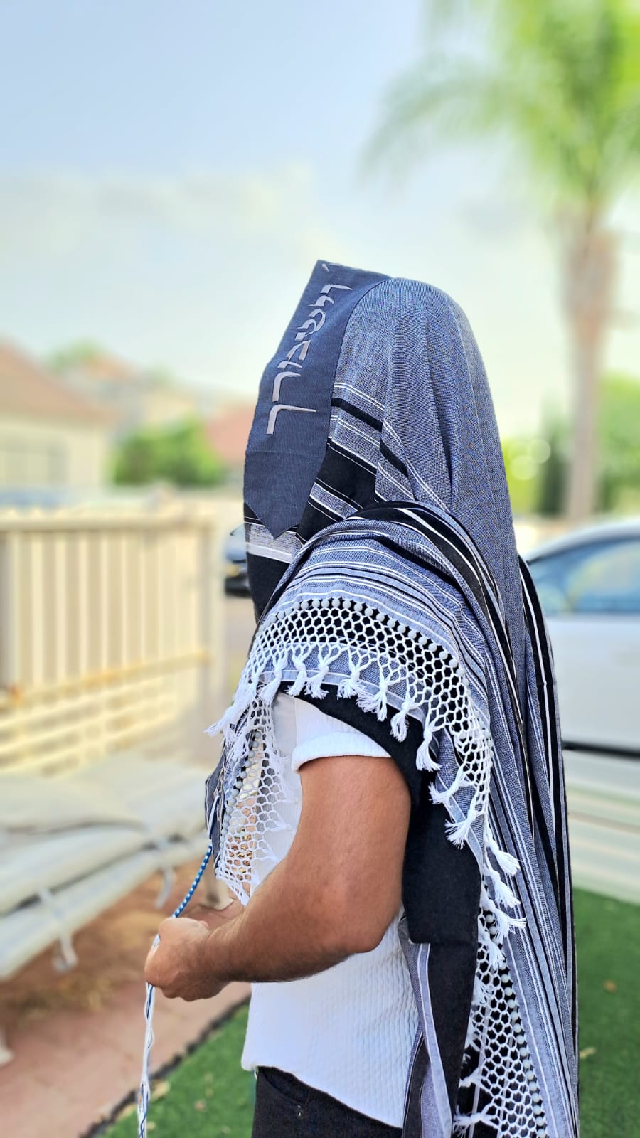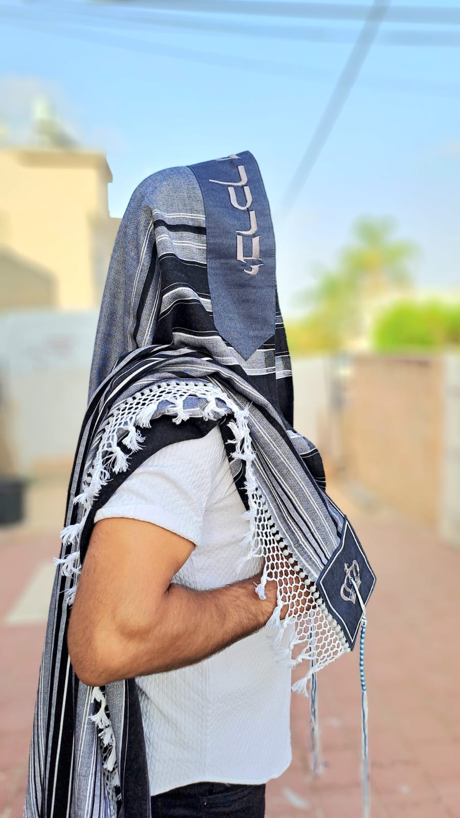 טלית מיוחדת במינה לחתן.. בגוון אפור כהה משולב עם ג'ינס 🤩
