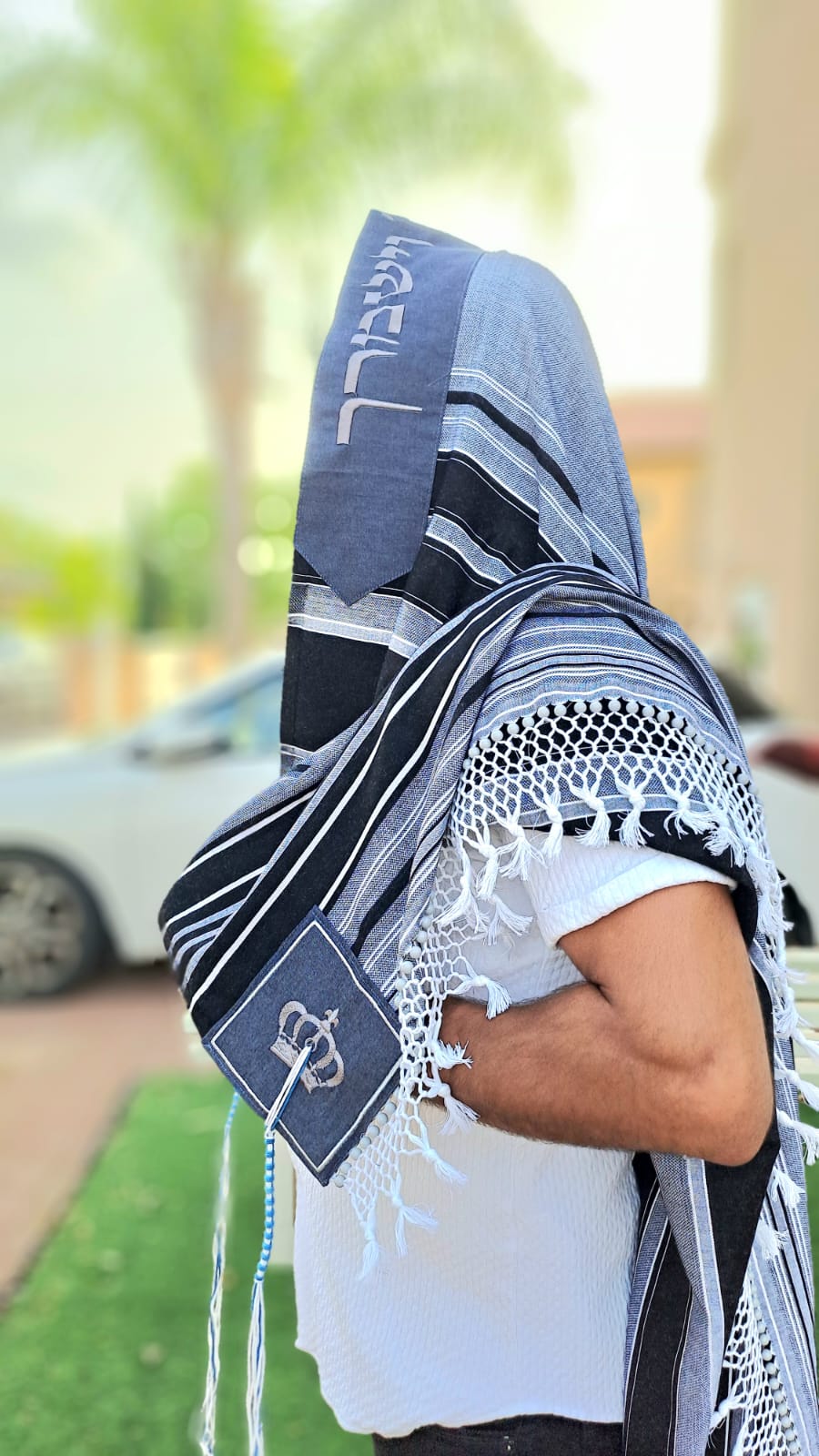 טלית מעוצבת לחתן "כתר – ג'ינס" בגוון אפור כהה