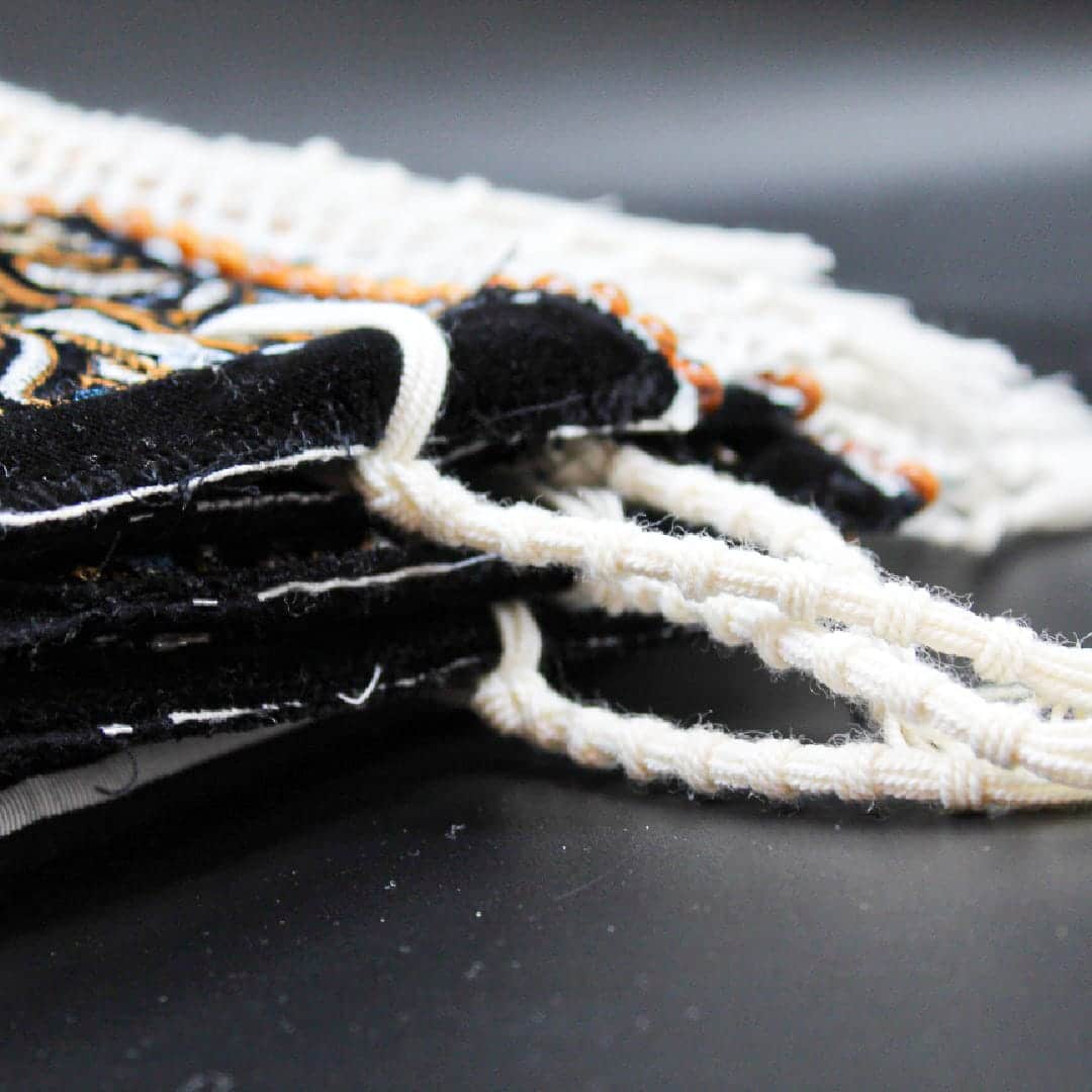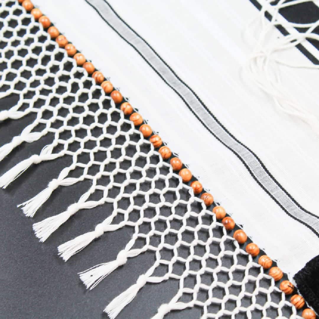 קצוות הטלית מעוטרים בחרוזי עץ טבעי, המשתלבים בעבודת יד מדהימה ליצירת רשת מרשימה של שבע שורות. חוטי הציצית שוזרו בעבודת יד באיכות גבוהה עם עובי בינוני, תוך הקפדה על גימור נקי ועמידות לאורך זמן. בנוסף, ניתן להתאים את קשירת הציצית לפי המנהג הרצוי, כולל שילוב של ציצית פתיל תכלת.