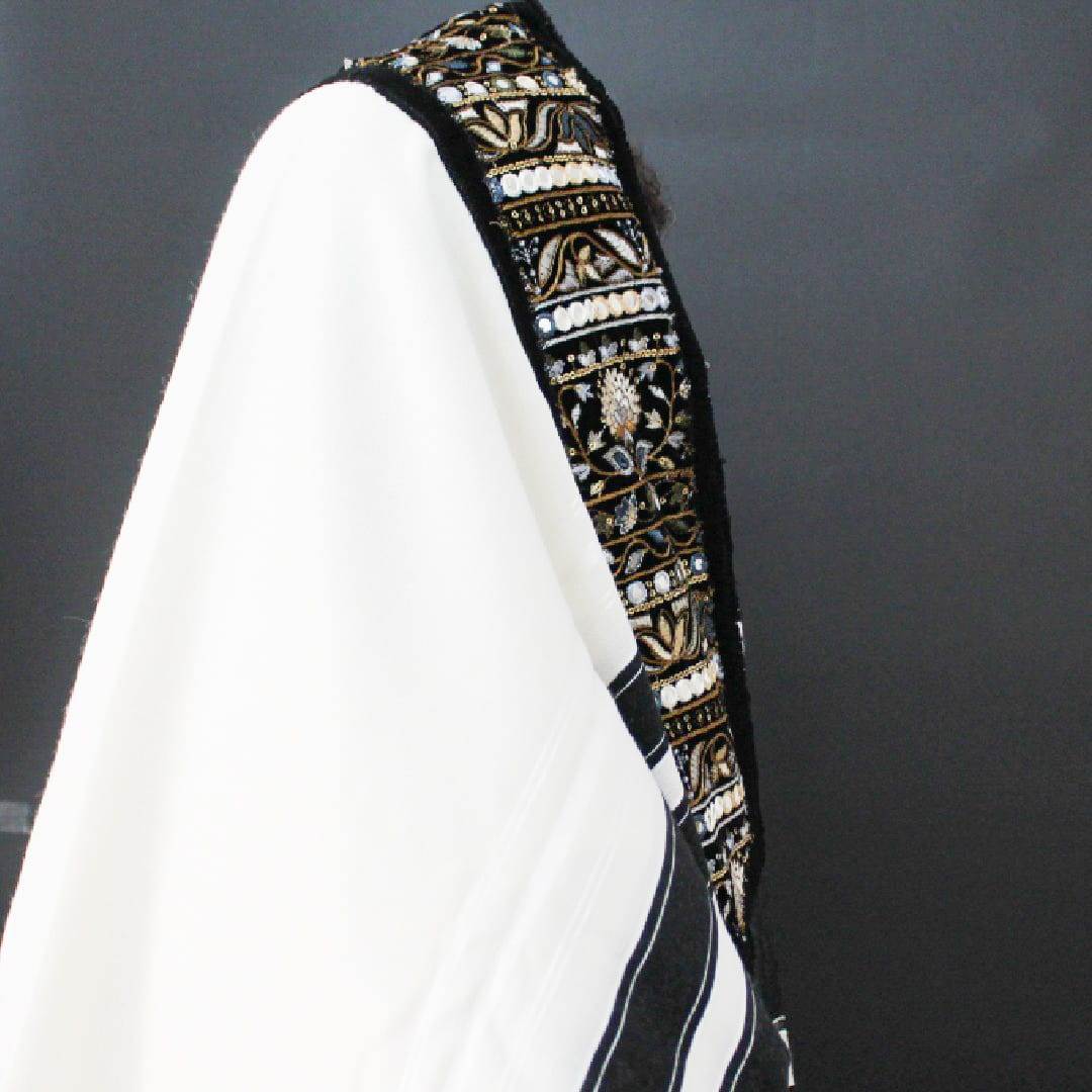 הטלית עשויה מבד איכותי של 100% צמר רחלים, ארוג באריגת תשבץ המבטיחה מניעת החלקה ותחושת נוחות מרבית. העטרה והפינות של הטלית עוצבו בעבודת יד מדויקת, לפי הזמנה אישית, ומשלבות עיצוב אותנטי, עדין וייחודי המותאם במיוחד למי שמחפש תשמישי קדושה מעוצבים ברמה גבוהה.