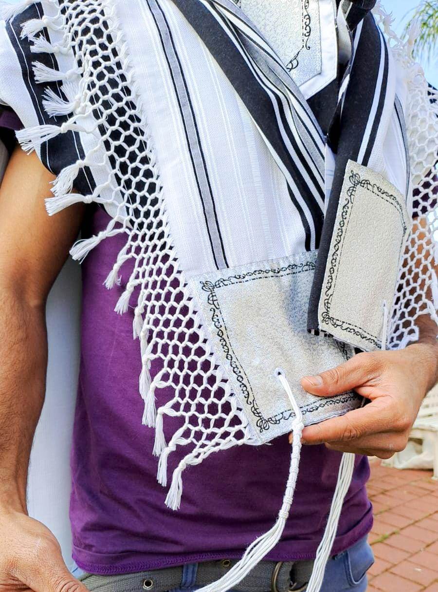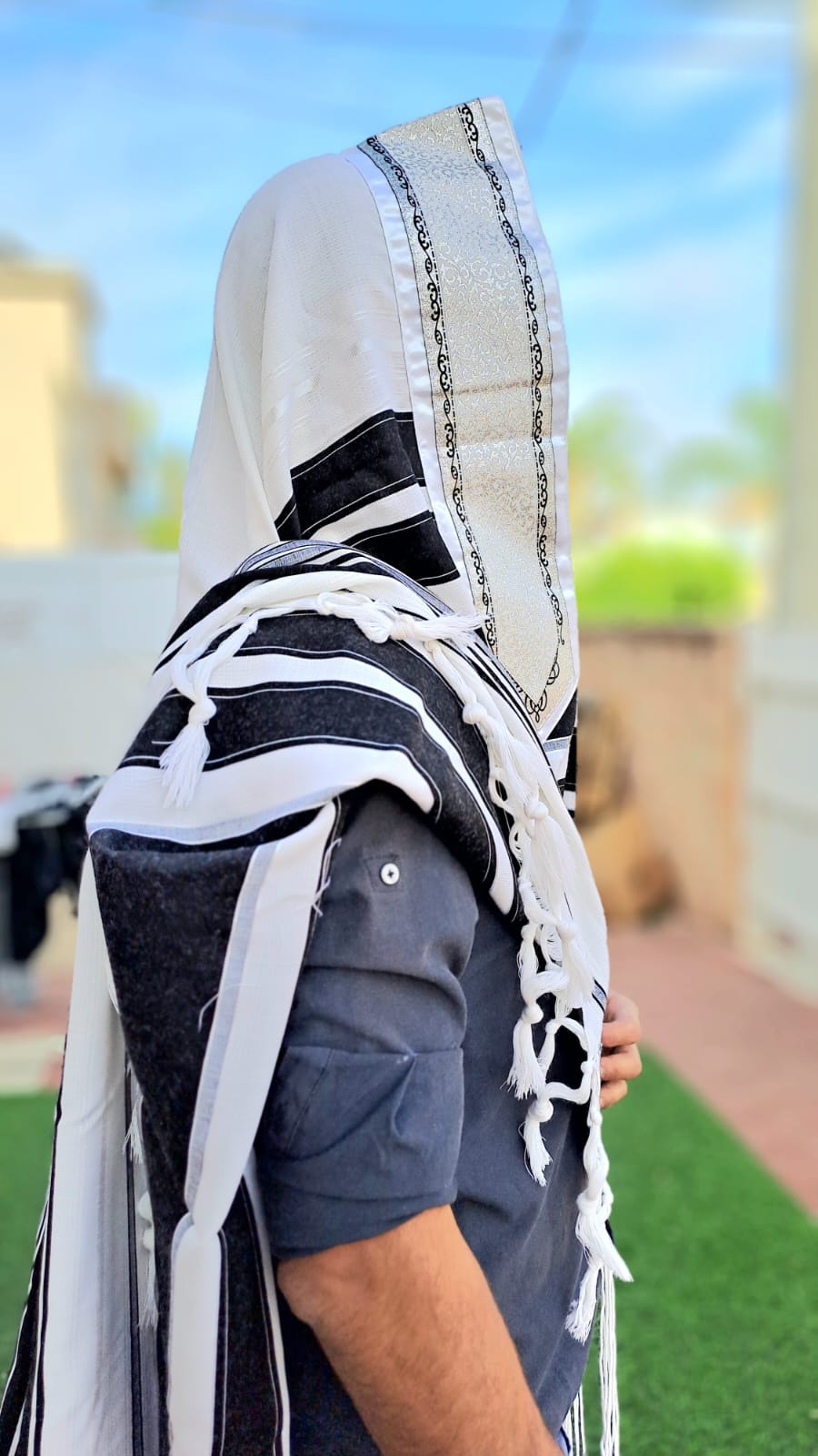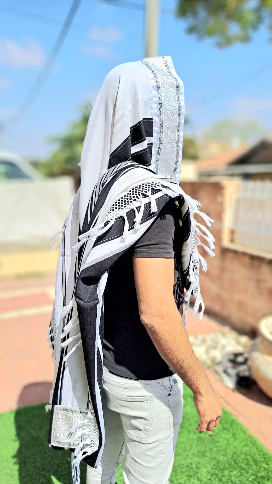 העטרה של הטלית עשויה סטן לבן משולב עם שחור כסף, גמיש ונוח על הצוואר.. כך שהעטרה של הטלית לא מכבידה על הצוואר והראש בזמן התפילה.. 💪