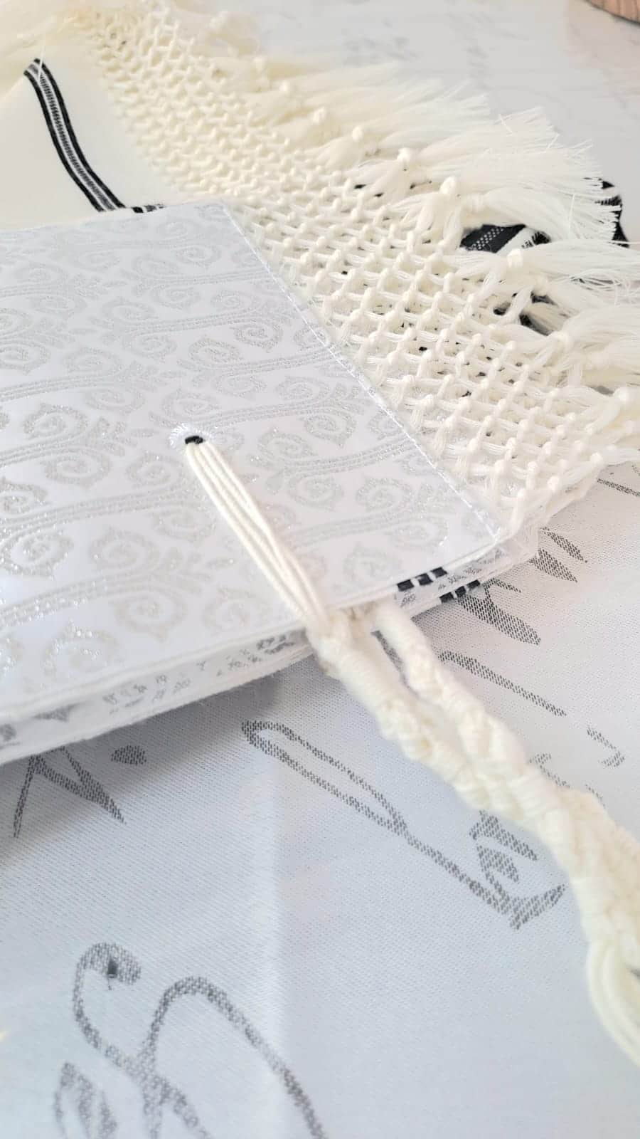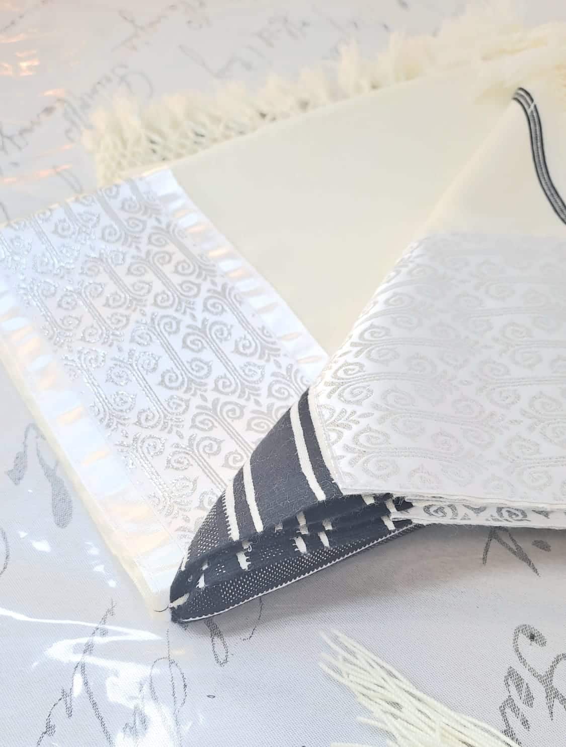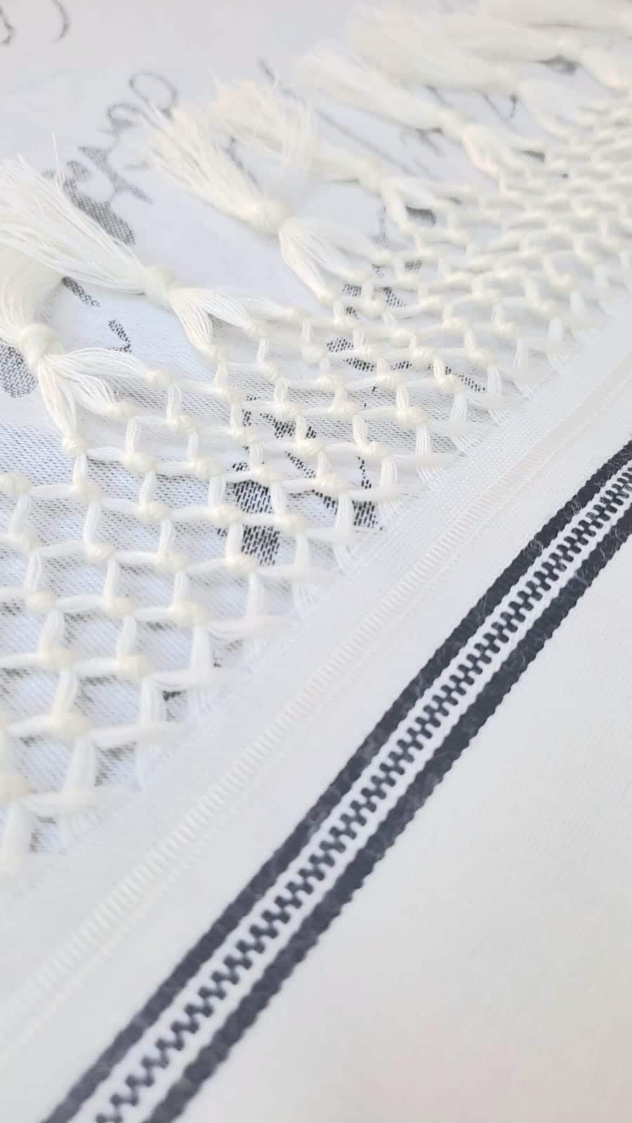 הטלית הזו כוללת עטרה ופינות בצבע מוכסף אלגנטי, אשר מעניקים לה מראה מהודר ומכובד, ומתאימים במיוחד למי שמחפש טלית מהודרת אך עם נוכחות שקטה. שזירת הקצוות בעבודת יד מוסיפה ממד של עמל אישי ואמנות יהודית מסורתית – כל טלית נוצרת כאומנות חד-פעמית. הרשת בקצוות הטלית נרקמת בקפידה, ומהווה סמל ליופי, סבלנות והשקעה שאינם מובנים מאליהם בימינו.