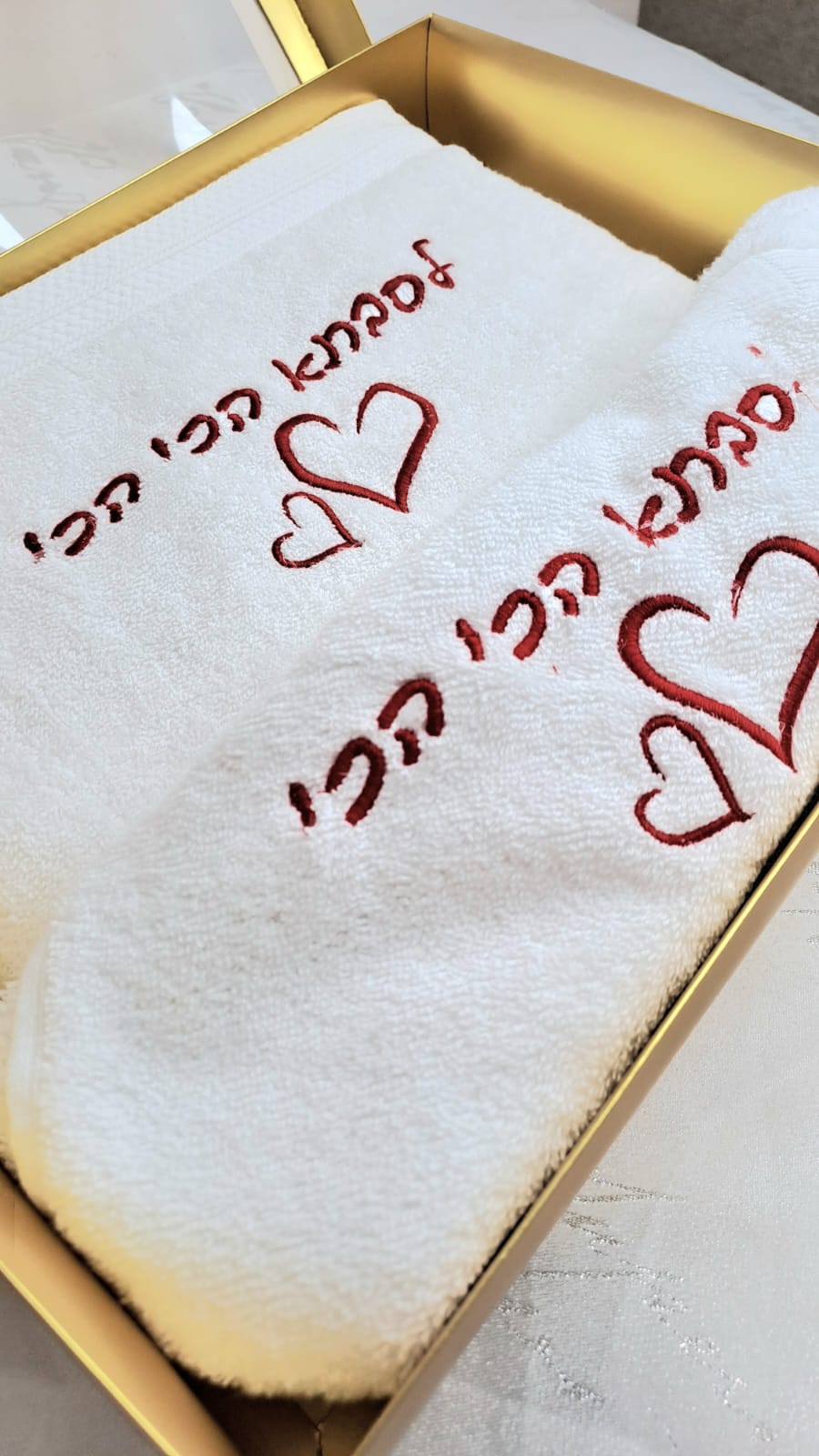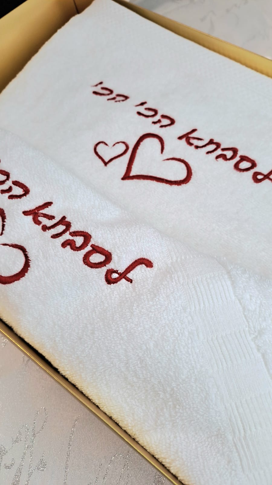 ניתן לבחור את צבע המגבות אדום או לבן. (במגבות אדומות הרקמה תהיה בצבע לבן).