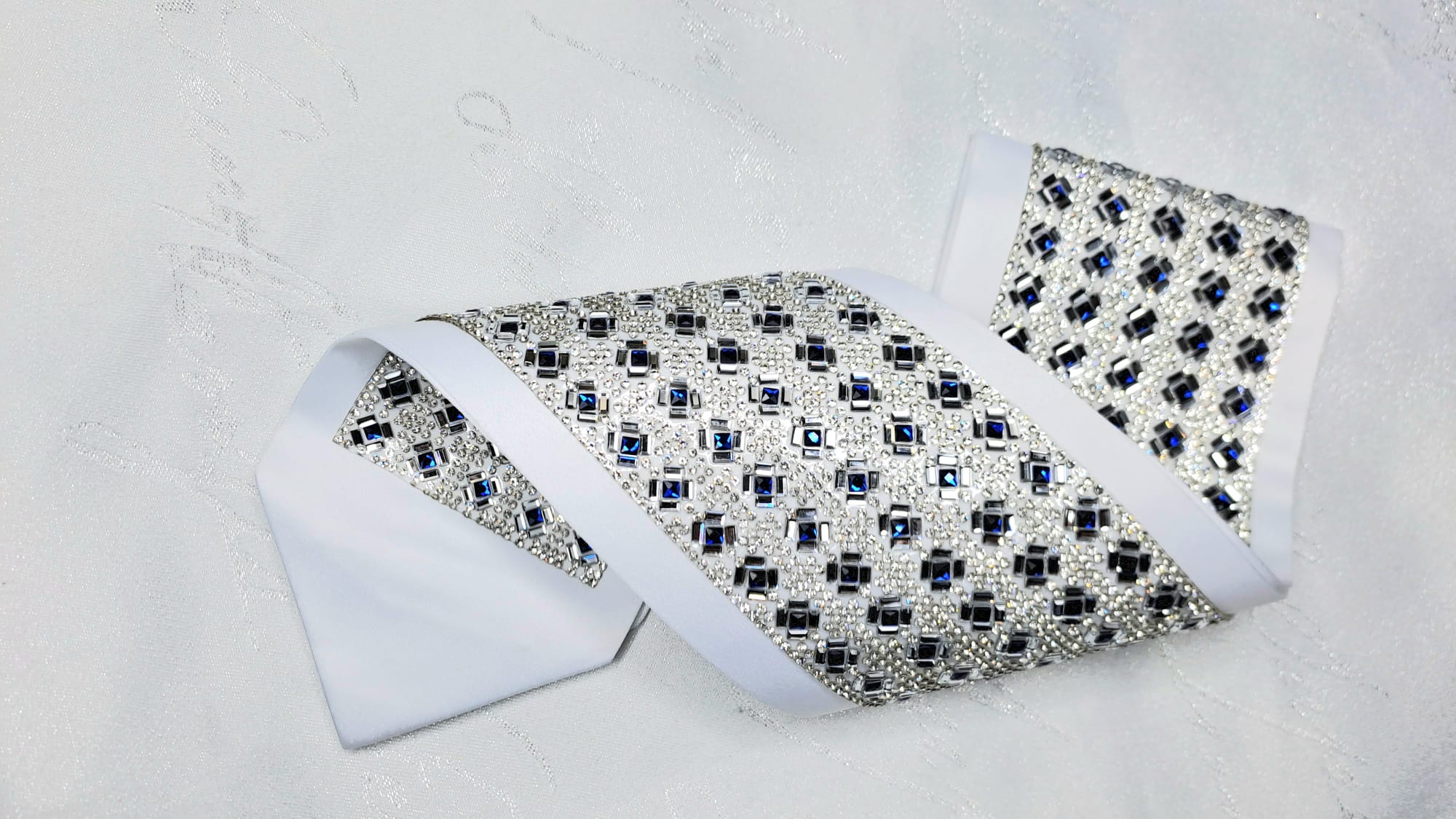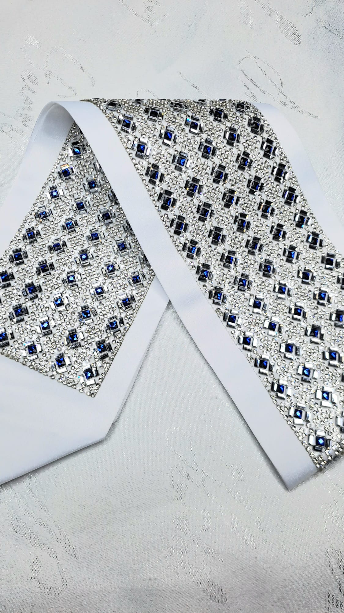 עטרה לטלית בעיצוב יוקרתי עדין ונוגע ברגש. אבני סברובסקי כחול וכסף נוצץ. העטרה מגיעה מוכנה לתפירה על הטלית.